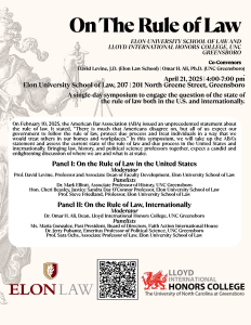 Come engage in a discussion on the rule of law in the U.S. and internationally on April 21, 4-7 pm. The “On the Rule of Law” symposium at Elon Law School (201 N. Greene St.), in partnership with Lloyd International Honors College, will be convened by Honors Dean Omar Ali and David Levine, Elon Law School Professor.